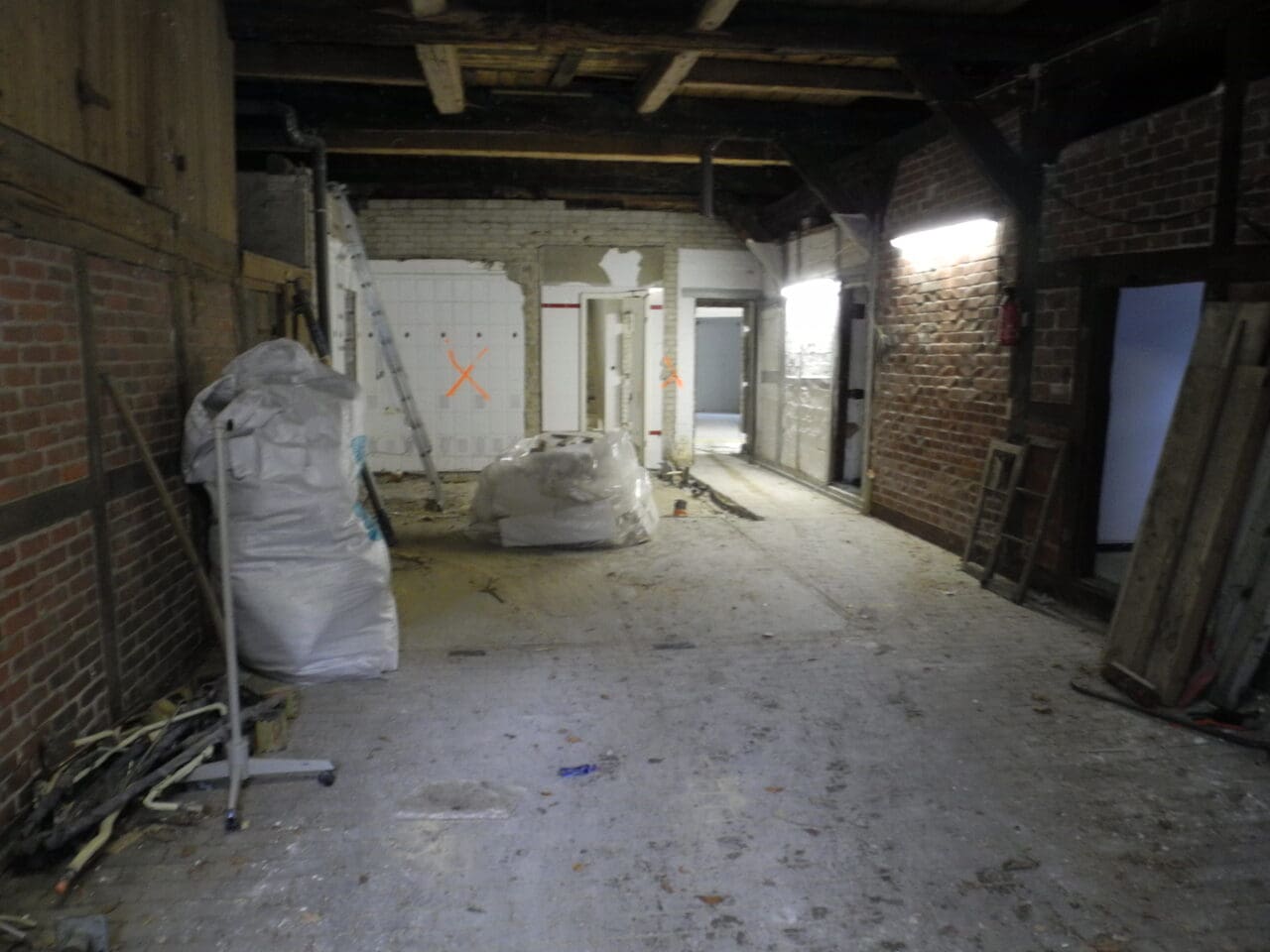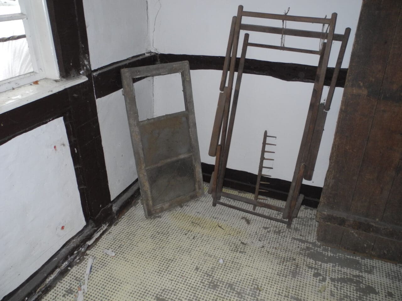 Im Dachgeschoss wurden erste Holzbohlen beiseitegelegt und die darunterliegende Dämmung entfernt. Die Vorbereitungen für die Trockeneisstrahlung der Dachkonstruktion laufen bereits, um die historischen Holzelemente sorgfältig mithilfe von Trockeneisstrahlung zu reinigen.