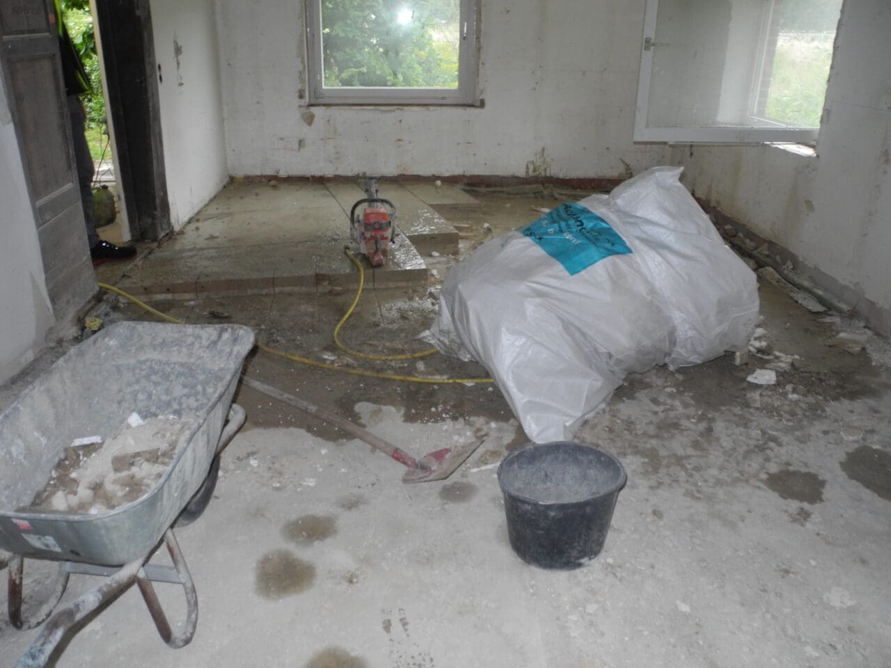 In der zukünftigen Bibliothek wurde der alte Estrich zurückgebaut. Auch die Böden der ehemaligen Badezimmer wurden teilweise entfernt, um einen neuen, niedrigeren Bodenaufbau zu ermöglichen, der mehr Raumhöhe schafft.