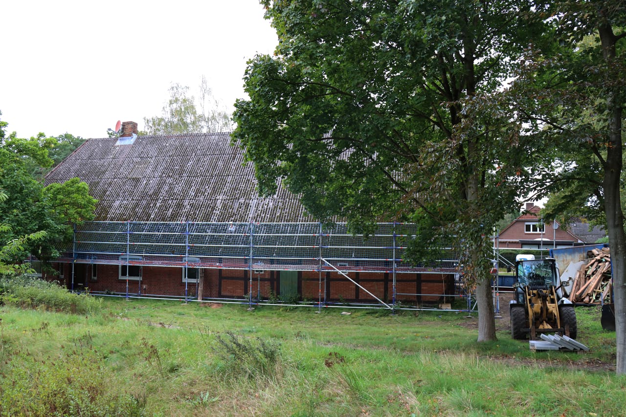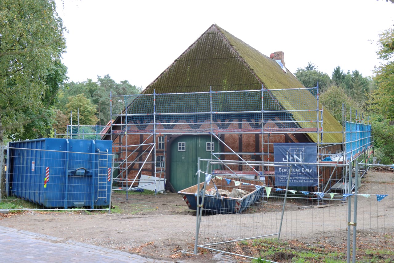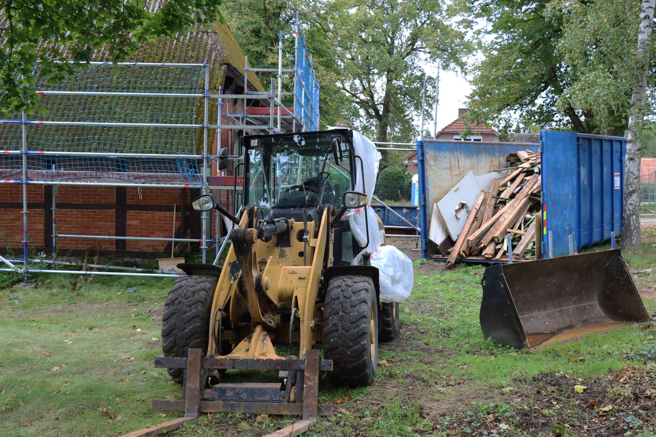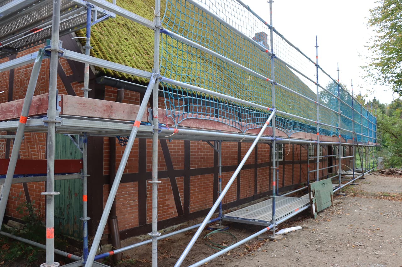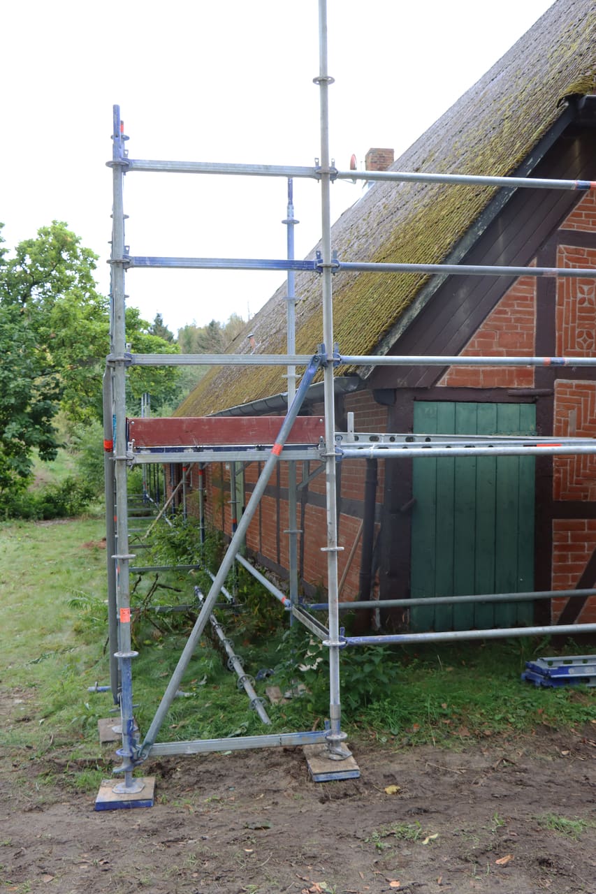 Im Außenbereich wurde das Gerüst aufgebaut, um Abriss- und Neubauarbeiten an Fassade und Dach durchzuführen. An der Westseite wurden Verkleidung und Blenden entfernt, wodurch altes Fachwerk und der obere Dachbereich sichtbar wurden. Das Fachwerk wird nun bewertet, um zu entscheiden, wie viel historische Substanz erhalten werden kann.
