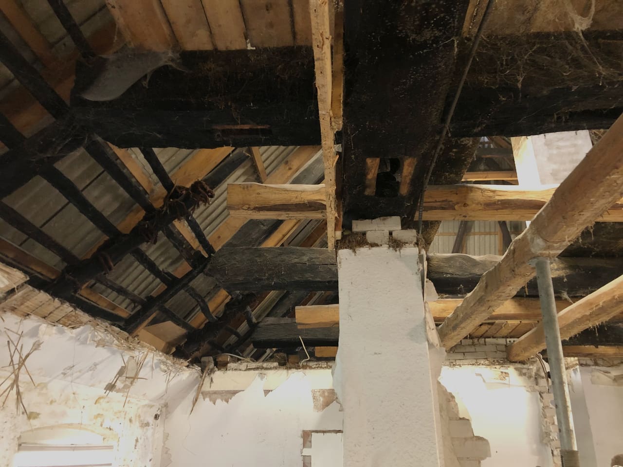 Durch den Rückbau der Rigipsplatten ist der alte Brandschaden gut sichtbar. Rußgeschwärzte Holzbalken rund um den Kamin werden mittels Trockeneisstrahlung gereinigt und später als historisches Element präsentiert. Einige nachträglich eingebaute Deckenbalken aus Nadelholz werden in den kommenden Wochen durch stabiles Eichenholz ersetzt.