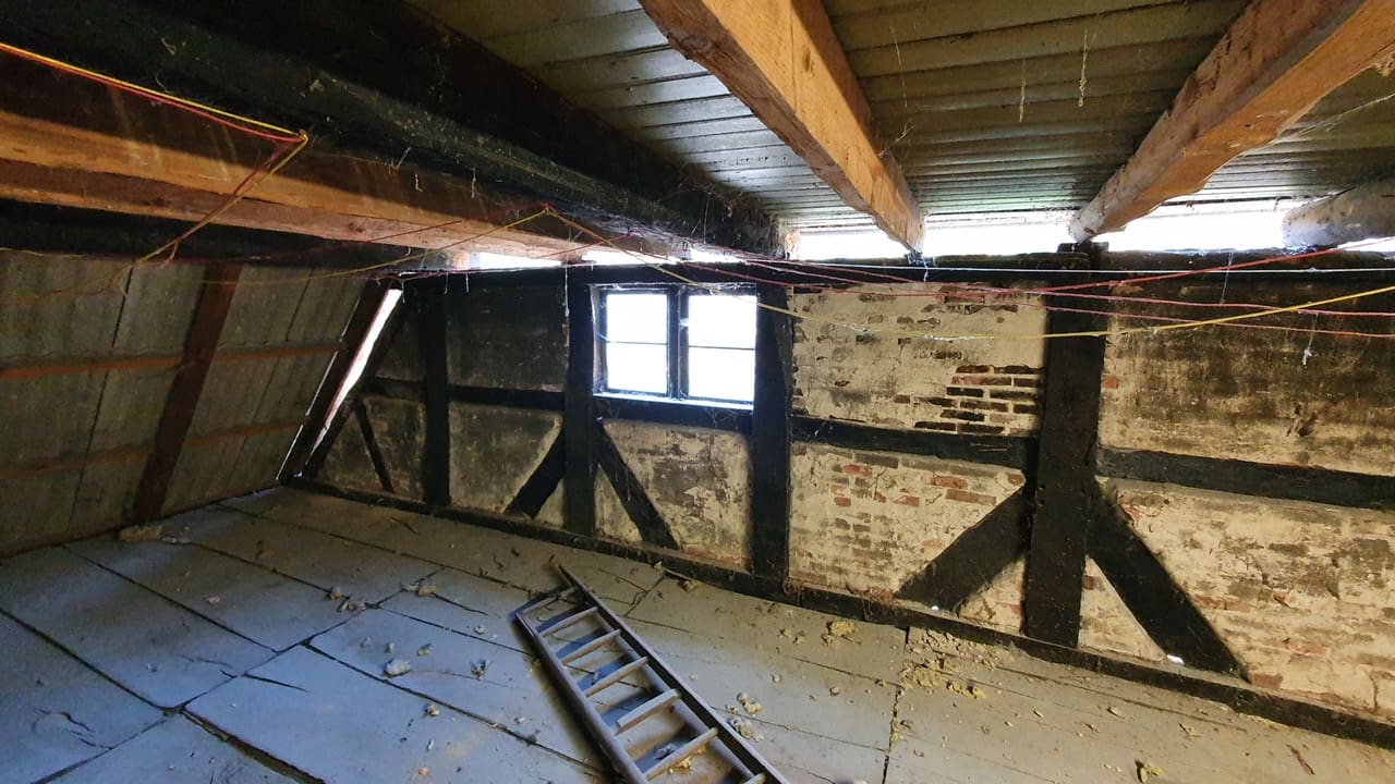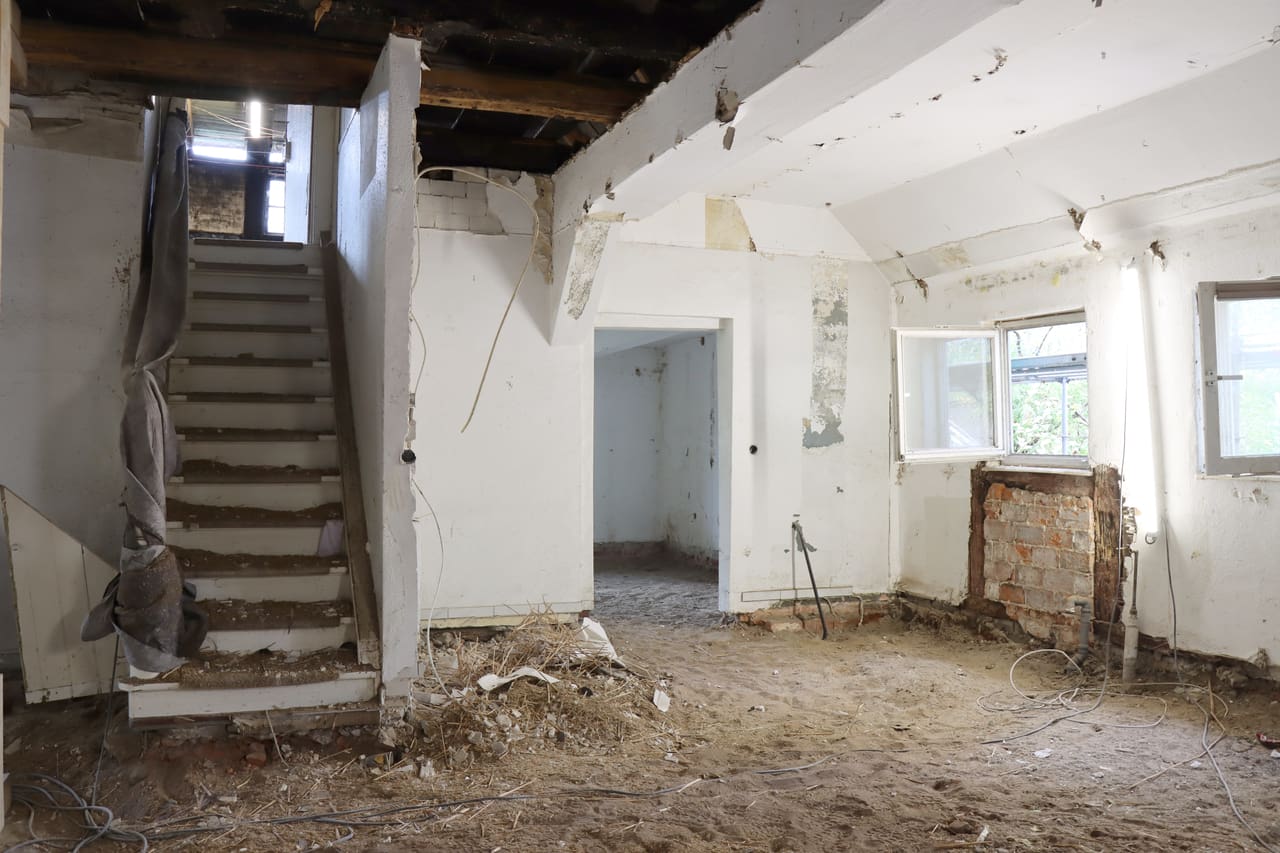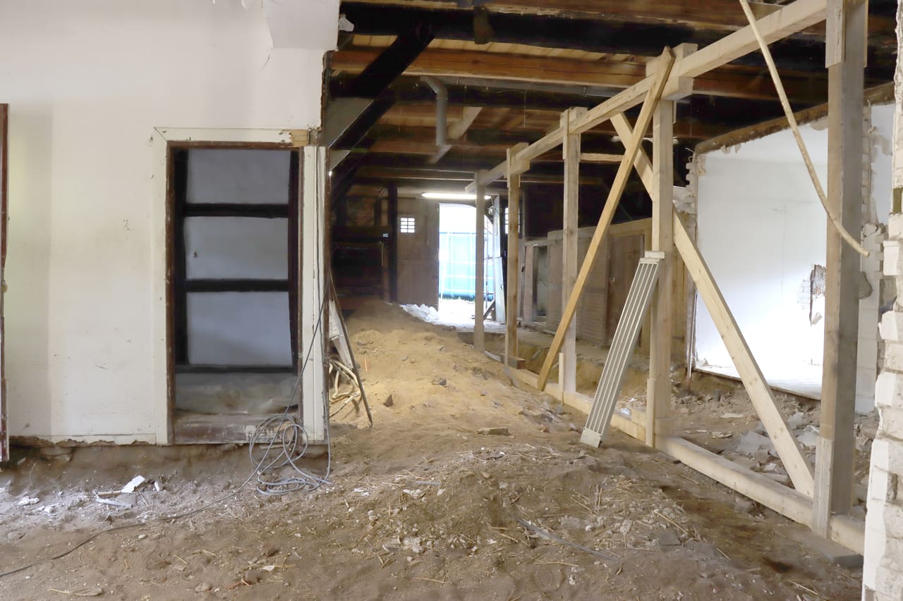 In der zukünftigen Bibliothek ist der Fußboden entfernt, wodurch die Balkenschwellen freigelegt wurden. Viele Balken sind stark beschädigt, ebenso die Balken um die Fenster in der ehemaligen Küche durch Ameisenfraß. Die Räume wirken bereits offener und heller, die vorher verschachtelten dunklen Bereiche gehören der Vergangenheit an.