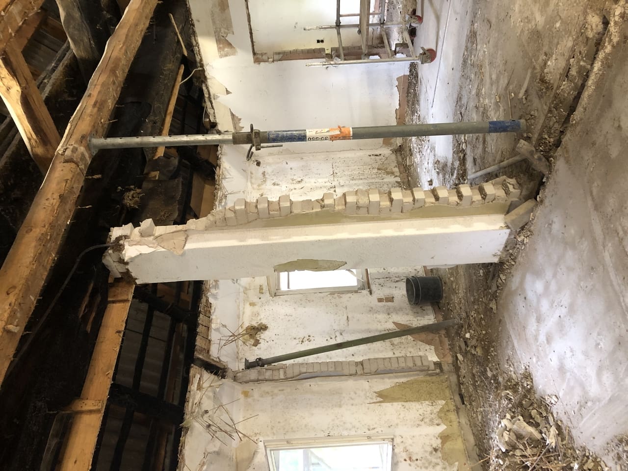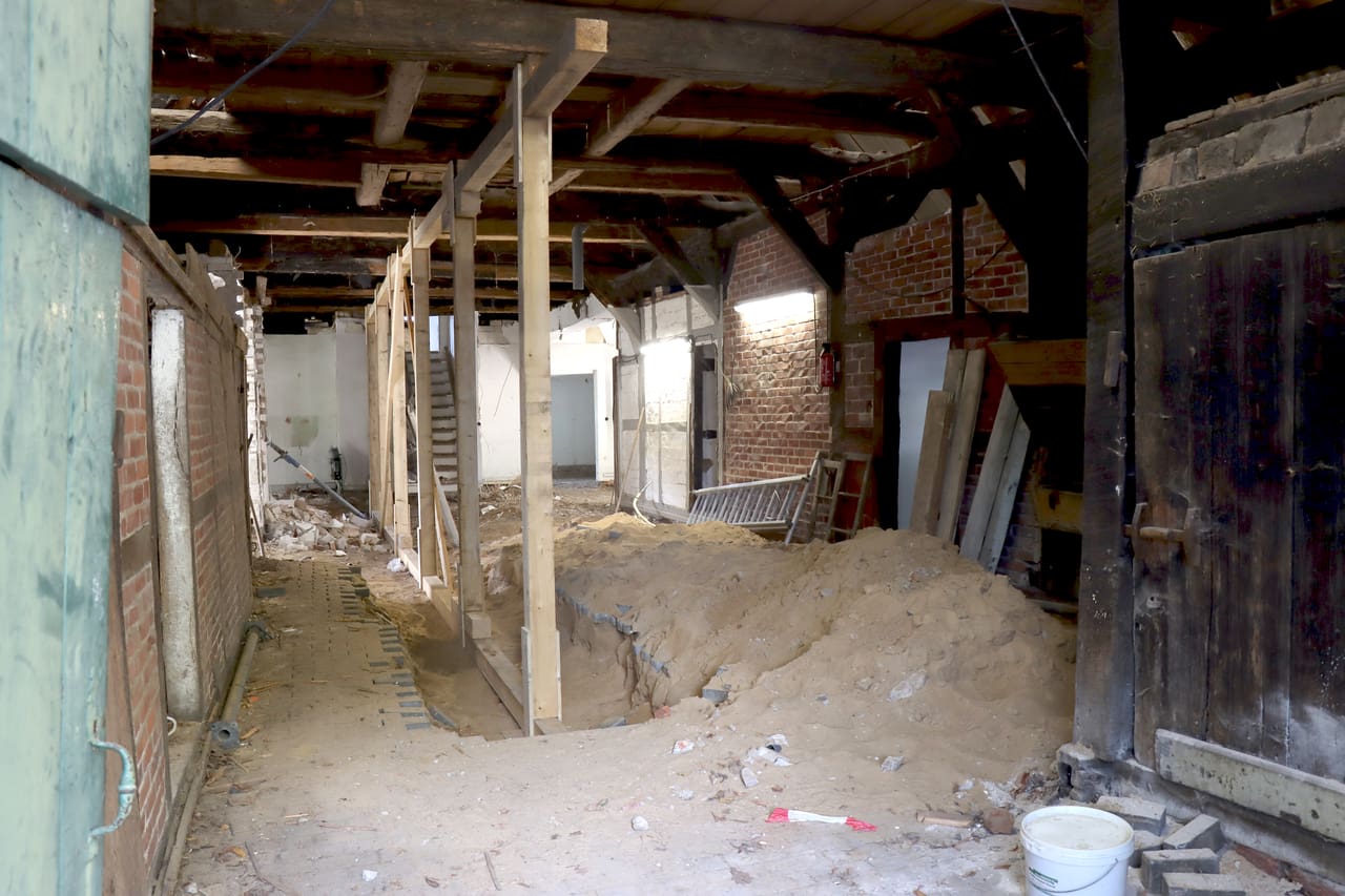 Dank der neuen Lastenverteilung durch Joch und Holzständer konnten weitere Wände entfernt werden. Die letzte Wand zwischen Diele und Flett blieb teilweise stehen, da ein wichtiger Trägerbalken fehlt. Dieser Bereich wird mit Drehsteifen verstärkt, und der Statiker legt die nächsten Schritte fest.