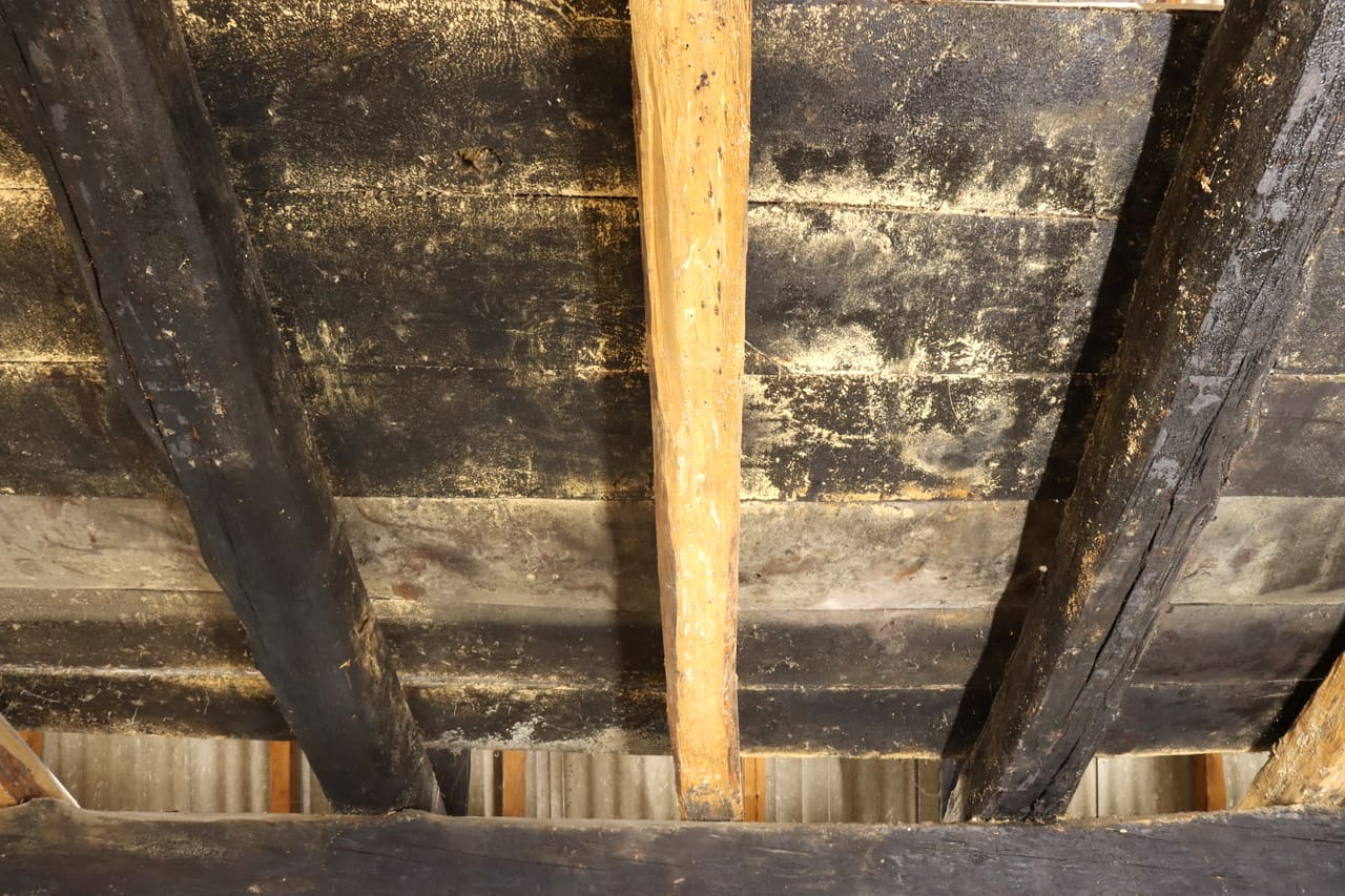 Ein großer Teil der Deckenverkleidung am Übergang von Dach zur Außenwand wurde zurückgebaut. Dabei sind historische Aufschieblinge sichtbar, die nach alter Bauweise mit dünnen Ästen an den Dachbalken befestigt wurden.