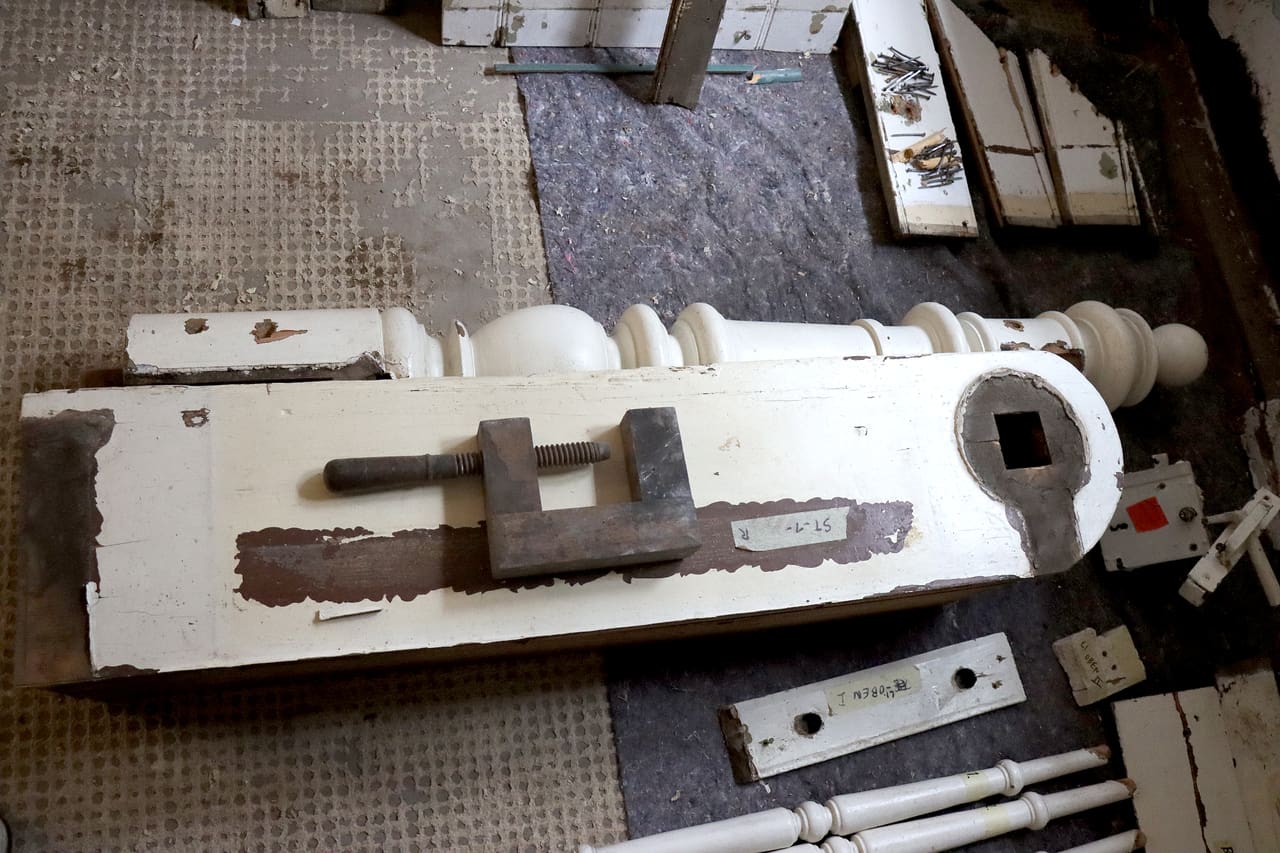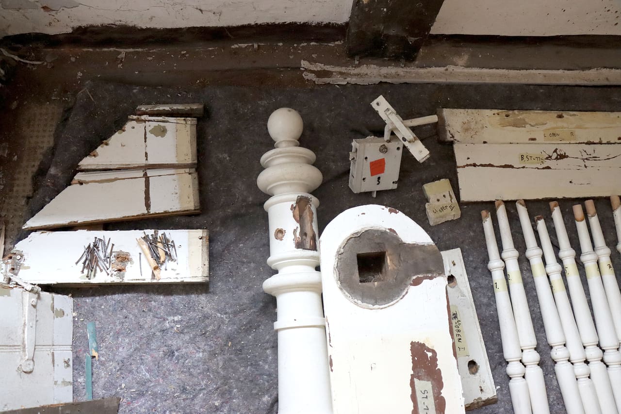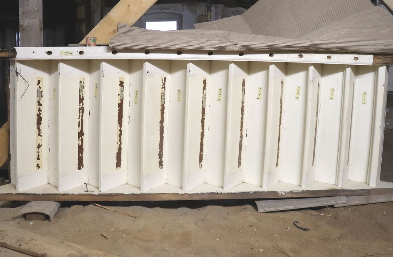 Die Freilegung der roten Wände im Flettbereich brachte Hinweise auf den ursprünglichen Treppenaufgang. Eine schräglaufende Unterbrechung der Bemalung zeigt die ursprüngliche Lage. Um die Treppe zu schützen, wurde sie ausgebaut. Unter mehreren Lackschichten kam die gleiche grüne Grundierung wie bei den Holzbrettern mit dem „schablonierten Fries“ zum Vorschein, vermutlich aus derselben Zeit.